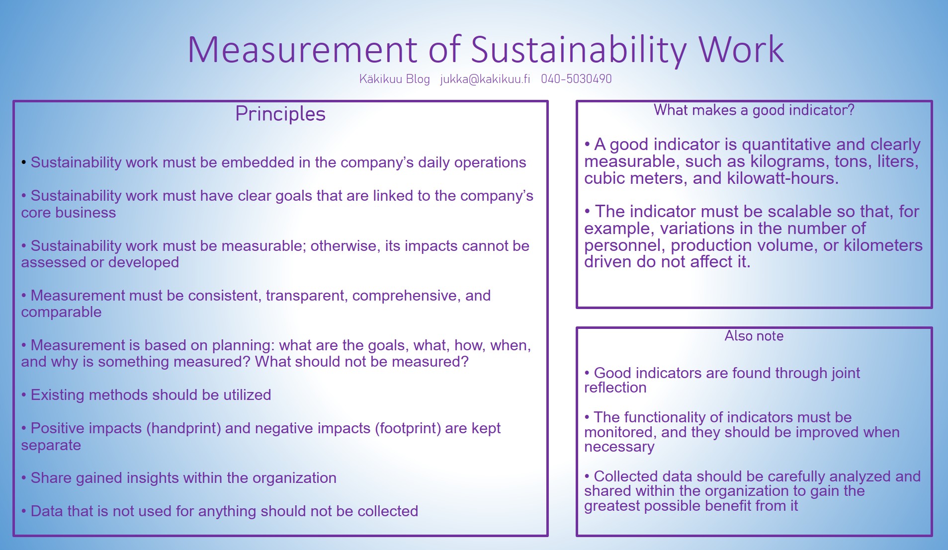 In general terms, measuring the results of sustainability work should be consistent, transparent, comprehensive, and comparable. Measurement must also be based on planning: what are our goals, what should we measure, how, when, and why? And what should we not measure? It’s also important to remember that while data can be interesting, data that is not used for anything is not worth collecting.